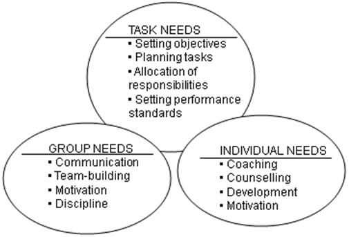 John Adair's action-centred leadership model is where task, group and individual needs are interconnected. The total situation dictates the relative priority which must be given to each of the three sets of needs. Effective leadership means identifying and acting on that priority to create a balance between the needs.