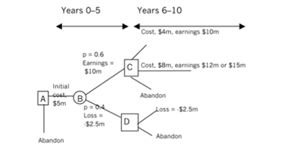 Now assume that further investigation shows that the project can be broken down into two, consecutive five-year blocks. The initial cost will be $5m and this will generate half of the original amounts: either a profit of $10m or a loss of $2.5m. Assume that after the first five years have passed, the company will have gained information that allows it to predict with certainty what the outcomes of the second five years will be. This is not unreasonable as the passage of time allows more information to be collected that can be used for further analysis. Also, events that had been a long way off are now closer and easier to predict. Therefore, the income figures shown below for the second five years are not known at the outset but are known after the first five years.