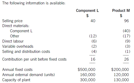 A manufacturing company,Man Co,has two divisions:Division L and Division M. Both divisions make a single standardised product. Division L makes component L,which is supplied to both Division M and external customers. Division M makes product M using one unit of component L and other materials. It then sells the completed product M to external customers. To date,Division M has always bought component L from Division L.