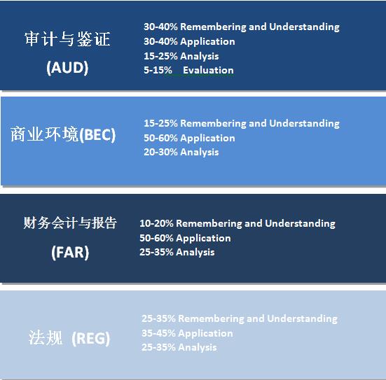 AICPA認為這四個能力是層層遞進的,也就是說如果考生通過了一個知識點對于Analysis能力的考察就默認考生在這個知識點也具有Application和Remembering and Understanding的能力。