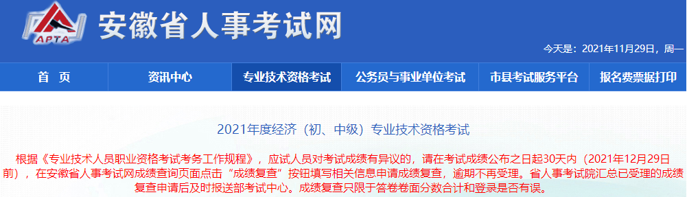 根據(jù)《專業(yè)技術(shù)人員職業(yè)資格考試考務(wù)工作規(guī)程》,安徽初中級(jí)經(jīng)濟(jì)師考試應(yīng)試人員對(duì)考試成績有異議的,請?jiān)诳荚嚦煽児贾掌?0天內(nèi)(2021年12月29日前),在安徽省人事考試網(wǎng)成績查詢頁面點(diǎn)擊“成績復(fù)查”按鈕填寫相關(guān)信息申請成績復(fù)查,逾期不再受理。省人事考試院匯總已受理的成績復(fù)查申請后及時(shí)報(bào)送部考試中心。成績復(fù)查只限于答卷卷面分?jǐn)?shù)合計(jì)和登錄是否有誤。