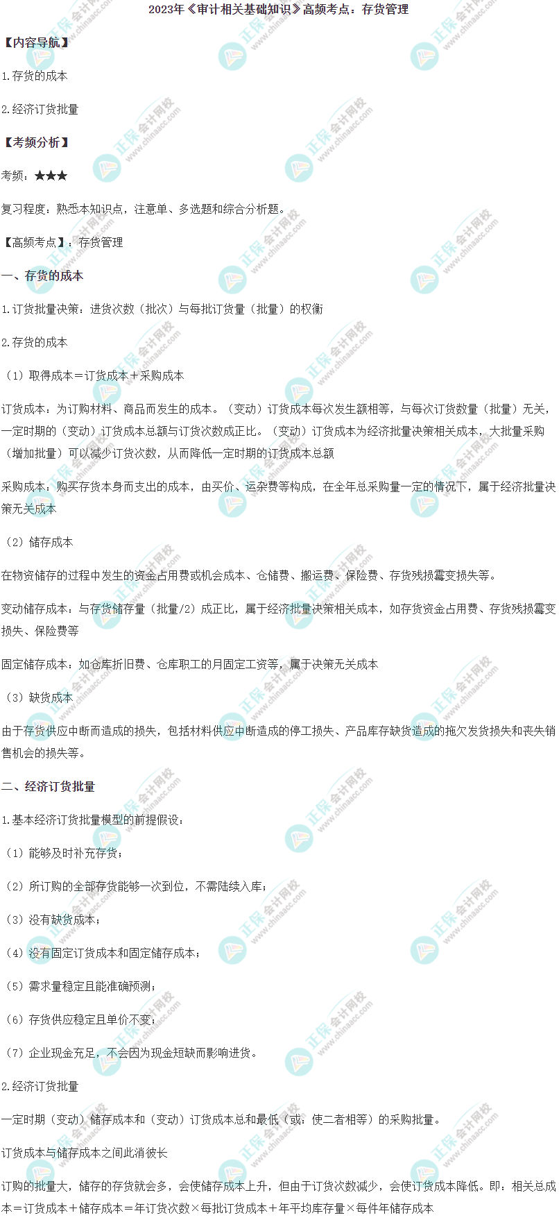 2023年初級《審計相關基礎知識》各章節哪些知識點經常考呢?老師給大家總結了!下面先看看2023年初級《審計相關基礎知識》高頻考點:存貨管理,好好復習哦!