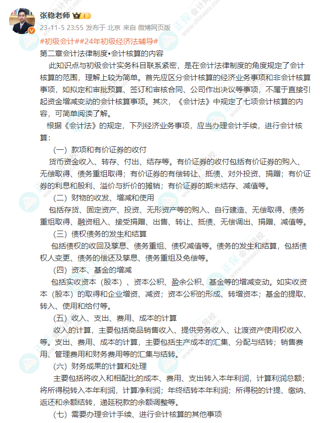 張穩老師陸續在個人微博上分享知識點學習,本次主要關于:第二章會計法律制度-會計核算的內容 相關知識點,同時給到大家學習提示等,快學!(PS:點擊圖片/保存可以查看大圖喲~)