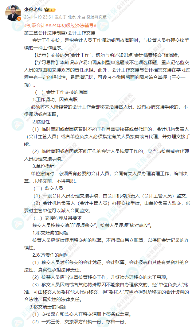 正保會計網校張穩老師在個人微博上分享的:第二章會計法律制度-會計工作交接 相關知識點,同時給到大家學習思路、學習提示等,抓緊學哦!(PS:點擊圖片/保存可以查看大圖喲~)