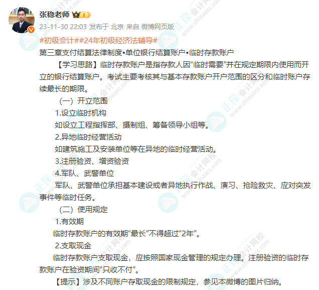 初級(jí)會(huì)計(jì)考試關(guān)于銀行結(jié)算賬戶(hù)的知識(shí)點(diǎn)有很多,正保會(huì)計(jì)網(wǎng)校張穩(wěn)老師在個(gè)人微博上分享:第三章支付結(jié)算法律制度-單位銀行結(jié)算賬戶(hù)?臨時(shí)存款賬戶(hù) 相關(guān)知識(shí)點(diǎn),同時(shí)給到大家學(xué)習(xí)思路,跟著老師提前學(xué)起來(lái)吧!(PS:點(diǎn)擊圖片/保存可以查看大圖喲~)