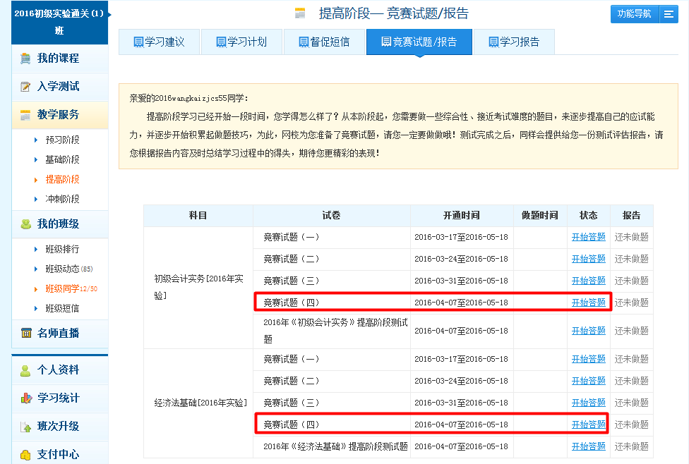 2016年初級會計職稱考試臨近,為了幫助學員提高應試能力、逐步累積做題技巧,正保會計網校特為精品班/實驗班/定制班學員準備了初級會計師考試科目《初級會計實務》和《經濟法基礎》提高階段競賽試題(含判卷點評和試題解析),該試題注重綜合性、并接近考試難度,通過競賽試題測試后,會根據您的得分、題目完成率、做題用時等情況為您提供一份詳細的測試評估報告,幫考生準確地把握考試方向、清楚復習思路,解決學員該階段復習迷茫、做題正確率不高的難題,確保備考。