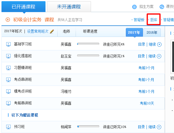 正保會計網校2017年初級會計職稱考試“我的題庫-基礎階段測試題”已開通,已報名學員可登錄“我的網校我的家”,點擊“題庫”開始酣暢淋漓的做題之旅!2017初級會計職稱“題庫”隨課贈送,隨學隨練,幫你全面提升應試能力!