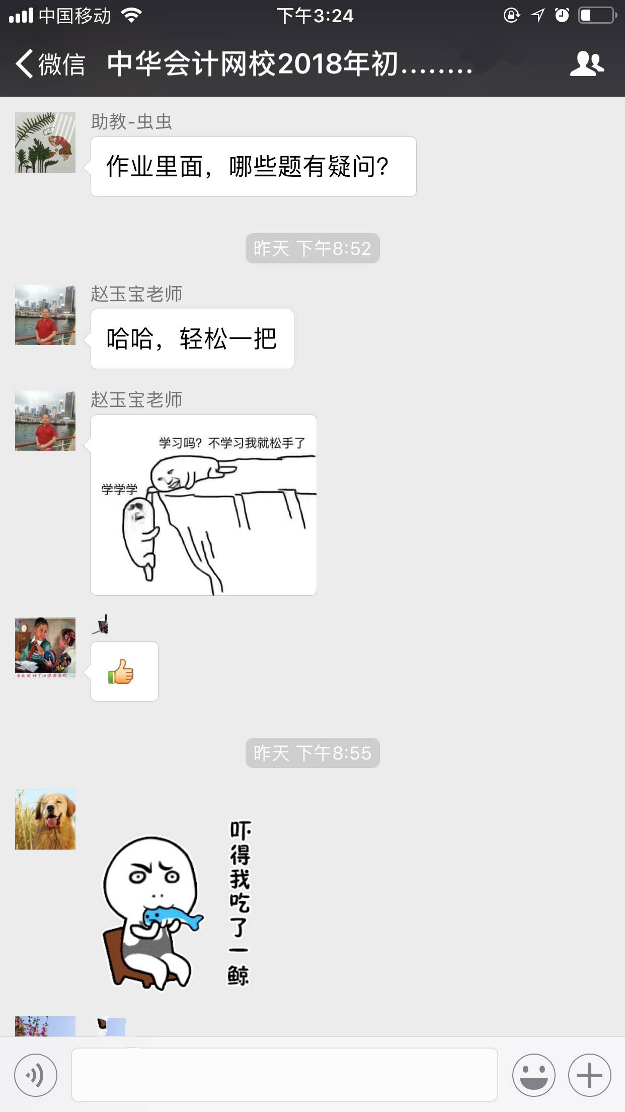 在課下,初級面授班的學員們還會經常聚在班群里,討論一些學習上、工作上遇到的各種問題,大家一起交流心得、分享經驗,保持著高度的熱情。就連我們正保會計網校的大咖級老師——趙玉寶老師,都忍不住要時常在面授班的交流群中與大家親密互動,看到趙老師這么用心的鼓勵大家,你是不是也深受鼓舞吶。