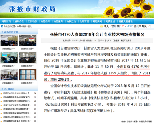 如上圖所示,在12月1日,甘肅省張掖市財政局公布了2018年初級會計考試現場確認交費的人數,有4170名考生報名!與2017年報名的1359人相比,增加了2811名,有206.8%的增長!這個數字可真是嚇壞小編了。在人口較少的甘肅,人數增長都有這么高的數量,作為人口基數和經濟體量更大的省份,廣東、山東、江蘇、河南、河北等省份的報名人數增長情況,也許更加超出想象。而且在這些人口大省,初級報名審核很多都是安排在考后進行的,也就是報名門檻比需要現場審核及網上審核的地區更加寬。而從實際感受來看,小編身邊的朋友,報名參加2018年初級會計考試的人數也超過了10人,而且大部分都是首次報名參加的。所以直觀的感覺就是2018年初級會計考試報名人數真的是漲瘋了!