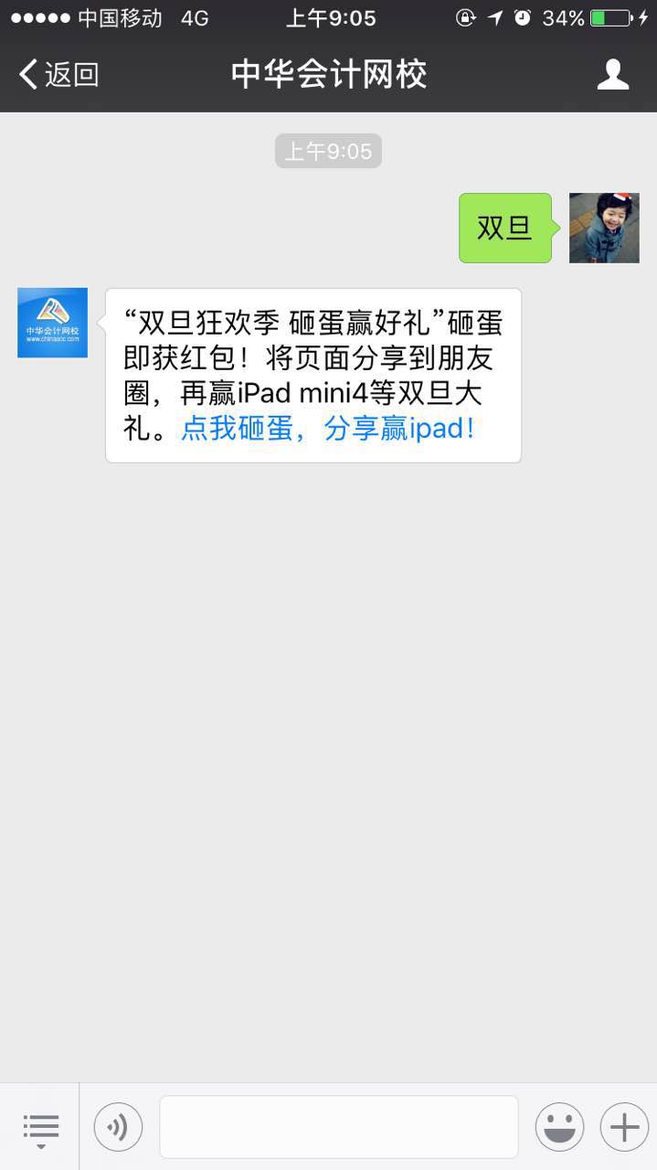 第一步:關(guān)注“正保會計(jì)網(wǎng)校”微信公眾號,回復(fù)“雙旦”點(diǎn)開鏈接即可砸蛋贏學(xué)費(fèi)(活動一定要在微信應(yīng)用打開才有效哦!)