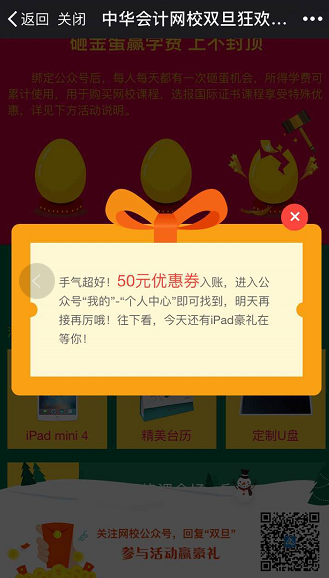 第二步:獲得購課優(yōu)惠券還不夠,將此活動分享到朋友圈,即可隨機(jī)獲得網(wǎng)校為大家準(zhǔn)備的豪禮——ipad mini4、精美臺歷、定制U盤,5折實(shí)務(wù)購課券、8.5折初級會計(jì)職稱定制上崗班購課券。中獎幾率為100%,贏取大獎的機(jī)會決不能放過!趕緊分享吧。