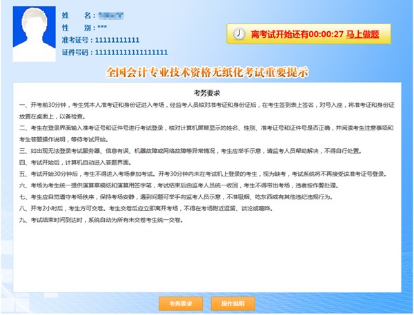 點擊“開始考試”后登錄虛擬賬戶,就能看到嚴肅的考務要求,此時瞅見右上角的倒計時后,瞬間緊張起來了。等30秒倒計時結束后,系統將自動進入考試環境,答題正式開始(如果你是急性子,也可以手動點擊馬上做題開始)。