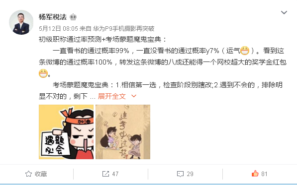 一直看書的通過概率99%,一直沒看書的通過概率7%(運氣)。看到楊軍老師微博的通過概率100%,轉發(fā)這條微博的八成還能得一個網校超大的獎學金紅包。