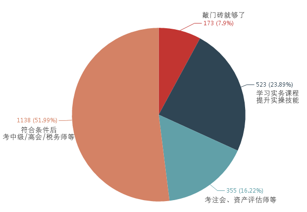 90%以上的考生還是選擇繼續提升自己,轉戰其他財會考試或者學習實操技能,我們的財會人是相當正能量了!也可以看出行業的競爭壓力,你若是在原地踏步,時代拋棄你的時候可是不會和你說再見的。