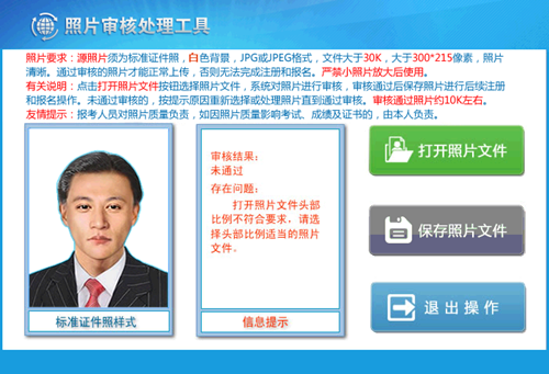 (1)源文件必須是標準證件數字照片,白色背景,JPG格式,大于30KB,像素>=300*215;