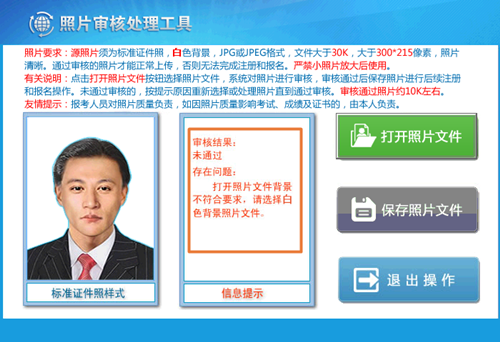 照片審核工具會實時審核考生提供的照片,針對不符合要求的照片,審核工具會提示未通過審核的原因。