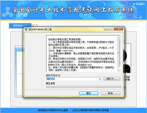 當考生登錄初級會計考試報名入口后就可以看到“上傳照片”的頁面提示,并且還提供了“報名照片審核處理工具”的下載鏈接,考生可以點擊鏈接下載照片審核工具,也可以(點擊這里>>)直接下載哦。