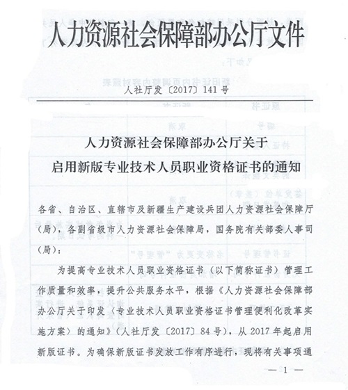 人力資源社會保障部辦公廳關(guān)于啟用新版專業(yè)技術(shù)人員資格證書的通知