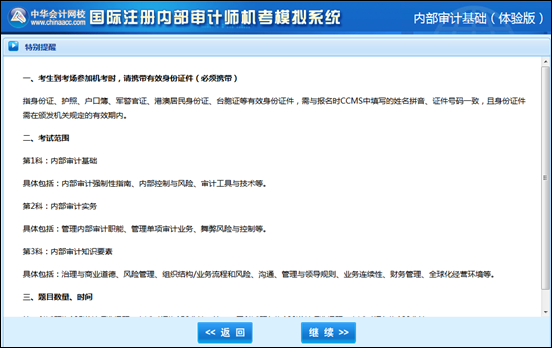 國(guó)際注冊(cè)內(nèi)部審計(jì)師無(wú)紙化模擬系統(tǒng)體驗(yàn)版現(xiàn)已開(kāi)通“考試系統(tǒng)”模塊!能夠模擬真實(shí)的考試環(huán)境。在考試開(kāi)始前有“考試提醒”和“考試介紹”等,做題中有倒計(jì)時(shí)顯示,題目可以進(jìn)行標(biāo)記,并區(qū)分已做題和未做題,便于考生在交卷前進(jìn)行檢查,以免遺漏。