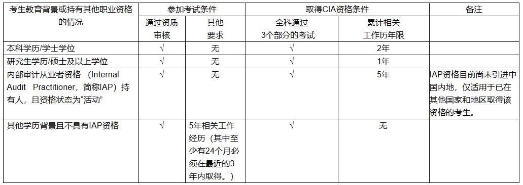 為了鼓勵廣大內部審計人員通過取得CIA資格提升職業能力,根據IIA在全球范圍內的統一要求,原則上只要具有本科學歷/學士學位及以上教育背景(如不能滿足教育背景的要求,則需要具有其他資格或滿足一定內部審計相關工作經歷年限的要求,包括內部審計、風險管理、內部控制、與內審相關的咨詢和評價服務、國家審計、社會審計等,下同),并通過資質審核,考生即可參加CIA考試。IIA同時強調了實務經驗的重要性,將內部審計相關工作經歷納入了認證流程,作為取得CIA資格的必要條件,具體年限要求由考生的學歷/學位(或其他符合準入條件的情況)決定,詳情見下表: