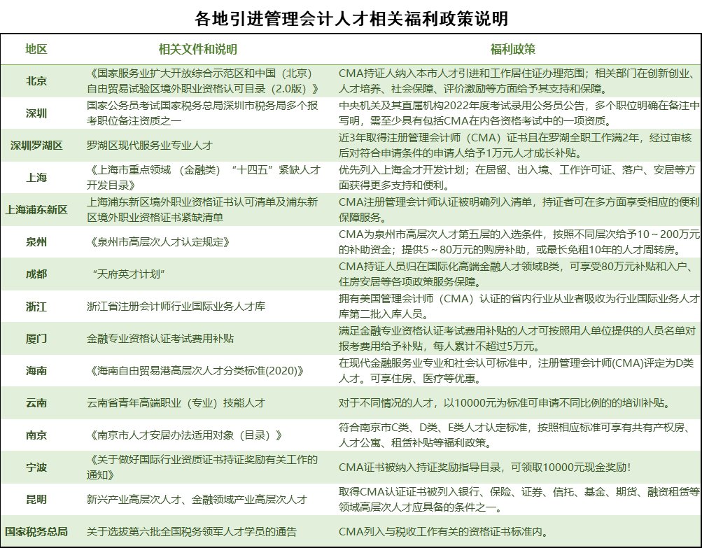 CMA在國內已得到了廣泛的推廣,全國多個地區針對CMA持證者陸續頒布了一系列相關福利政策,比如上海、浙江、海南、廈門、成都等地,針對CMA持證者給出安居補貼、子女入學、醫療保障、現金補貼等獎勵。