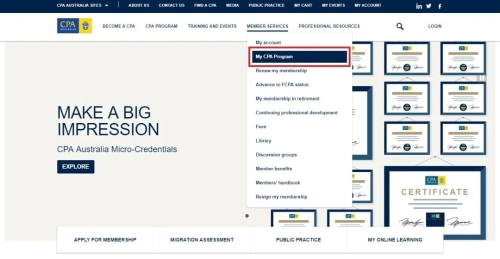 打開澳洲會計師公會官方網站(www.cpaaustralia.com.au),并在MEMBER SERVICES的下拉菜單中,點擊My CPA Program進入相應頁面(或點擊文末“閱讀原文”)。