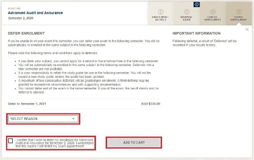 頁面跳轉至DEFER ENROLMENT頁面后請選擇需要延期考試的理由并勾選信息確認申明,點擊ADD TO CART。