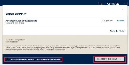 點擊頁面右上角的CART按鈕,您將看到自己所選的延期科目以及需要支付的延期費用。確認延期科目及費用信息,勾選同意申明,并點擊PROCEED TO CHECKOUT進行支付。支付成功后,您該科目的考試將自動延期至下一學期。