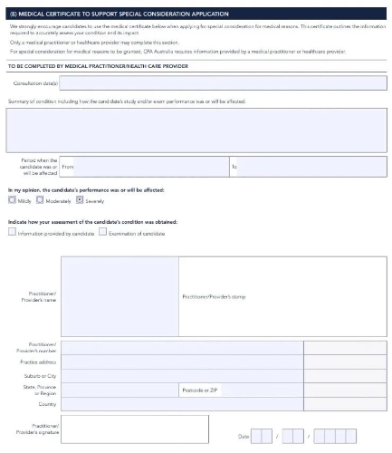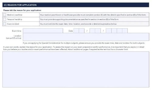 申請人必須在表格第一頁下方(C) REASON FOR APPLICATION的空白處描述您遇到的特殊情況,需要包括以下內容:申請的理由描述該情況是如何影響到您的學習或考試表現于此同時,所有申請都需要提交證明文件*。若您的證明文件為中文,必須同時提交該文件的正式英文翻譯件。