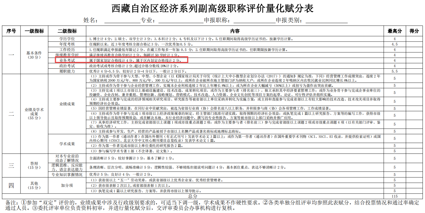 但各地高級(jí)經(jīng)濟(jì)師評(píng)審政策不同,例如西藏高級(jí)經(jīng)濟(jì)師職稱評(píng)價(jià)量化賦分表中明確:考試屬于國家劃定合格線計(jì)4分,屬于區(qū)內(nèi)劃定合格線計(jì)2分。所以對(duì)于西藏考生來說,高經(jīng)考試成績是否過國家標(biāo)準(zhǔn)會(huì)影響評(píng)審得分。截圖如下: