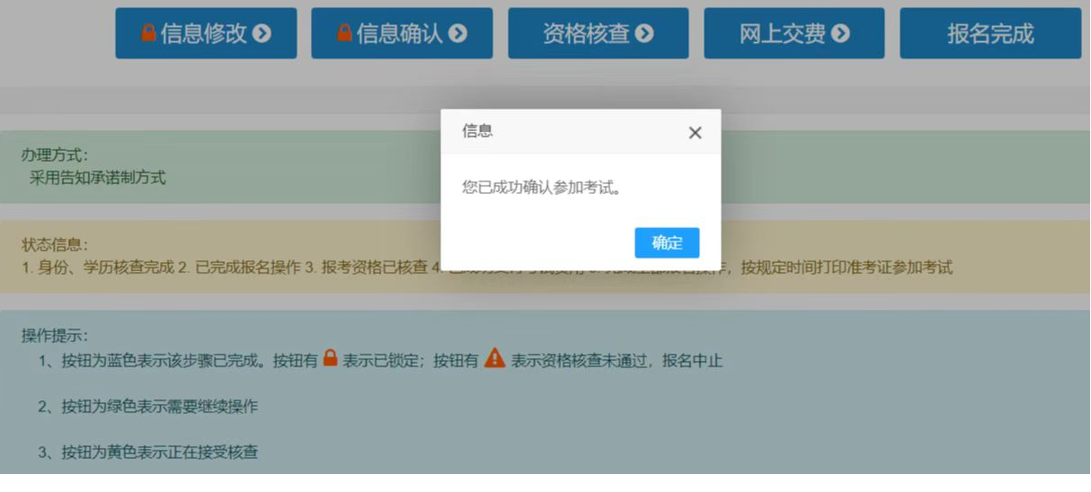(五)完成確認。確認參加考試成功后,系統顯示界面如下: