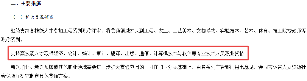 高技能人才參加經(jīng)濟(jì)、會(huì)計(jì)、統(tǒng)計(jì)、審計(jì)、翻譯、出版、通信、計(jì)算機(jī)技術(shù)與軟件等專(zhuān)業(yè)技術(shù)人員職業(yè)資格考試,應(yīng)符合國(guó)家和吉林省規(guī)定的報(bào)考資格條件。
