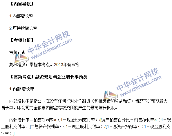 2016年高級會計師考試進入倒計時階段了,為了讓學員對考試情形有更好地認識,正保會計網校為大家精心整理了2016年高級會計師《高級會計實務》科目的高頻考點。下面我們一起來學習2016年高級會計師《高級會計實務》高頻考點:融資規劃與企業增長率預測。本考點屬于《高級會計實務》第二章企業投資、融資決策與集團資金管理第二節的內容。