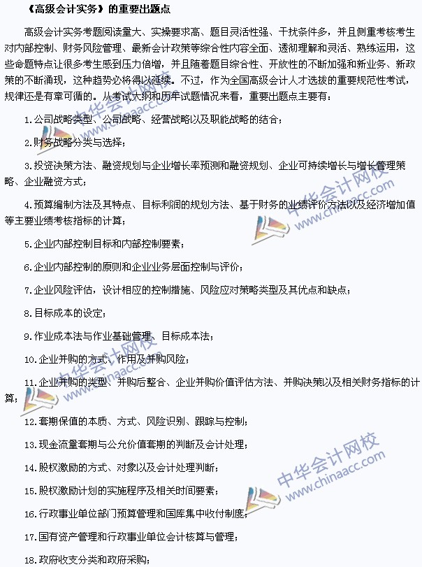 為了幫助參加2014年高級會計師考試的學員更好地備考,正保會計網校特為大家整理了高級會計師《高級會計實務》的重要出題點,幫助大家深入學習,提高備考效果,幫助廣大考生一起學習一起進步。下面,我們來看下高級會計師《高級會計實務》重要出題點,目的是把握2014年的學習方向,這一點對于準備參加2014年考試的考生非常重要。