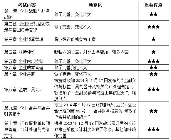 (2)根據(jù)2014年春天財(cái)政部修訂發(fā)布的《企業(yè)會(huì)計(jì)準(zhǔn)則第33號(hào)——合并財(cái)務(wù)報(bào)表》,修改了合并范圍的確定等內(nèi)容。2014年考試大綱的內(nèi)容、新變化和復(fù)習(xí)重點(diǎn)章見下表。