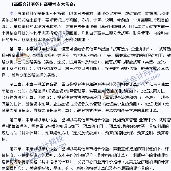2014年高級會計師備考已經進入強化沖刺階段,為幫助考生們高效備考,正保會計網校教學專家根據豐富的教學經驗,整理了高級會計師《高級會計實務》考試的高頻考點,供考生們在有限時間內重點復習,請大家抓緊時間復習!網校祝廣大考生夢想成真。