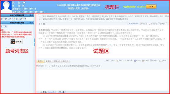 標題欄中間位置為本場考試科目名稱,左側為考生基本信息,包括考生照片、姓名、性別、準考證號和證件號碼。右側為本場考試科目剩余時間信息和“交卷”按鈕。