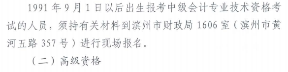 1991年9月1日以后出生報(bào)考中級(jí)會(huì)計(jì)專業(yè)技術(shù)資格考試的人員,須持有關(guān)材料到濱州市財(cái)政局1606室(濱州市黃河五路357號(hào))進(jìn)行現(xiàn)場(chǎng)報(bào)名。