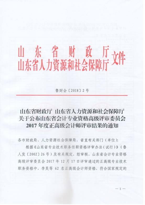 關于公布山東省會計專業資格高級評審委員會2017年度正高級會計師評審結果的通知