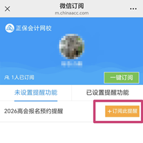 操作步驟:掃碼關注“會計大叔”->點擊“點擊訂閱”->找到“2024高會報名提醒”->訂閱此提醒即可。2024高級會計師報名入口開通后,網校將及時給您發送微信通知,敬請關注!
