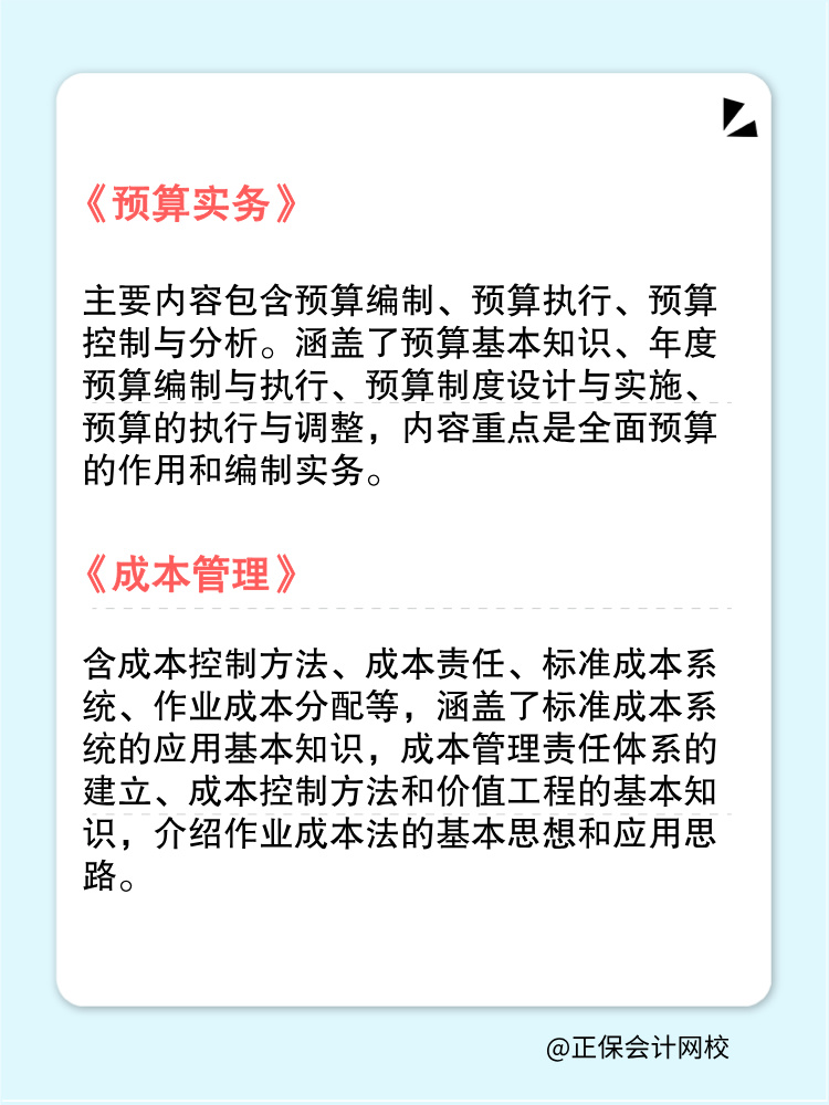 ● 管理會計師初級緊扣預(yù)算、成本兩大核心領(lǐng)域,幫助學員更快地適應(yīng)管理會計一般崗位的需求,并為以后的管理會計學習打下良好的基礎(chǔ)。