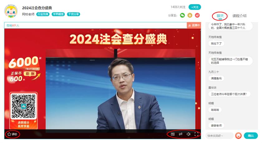 直播課功能:互動聊天、切換窗口、全屏、評價等功能。