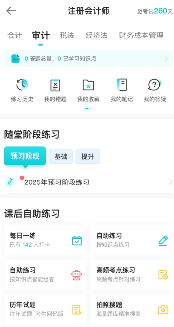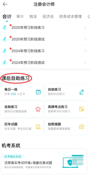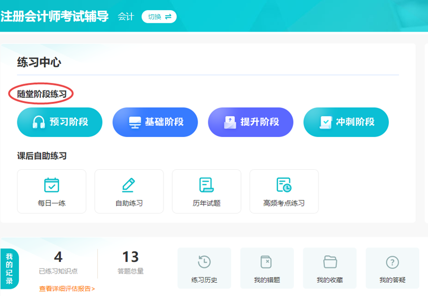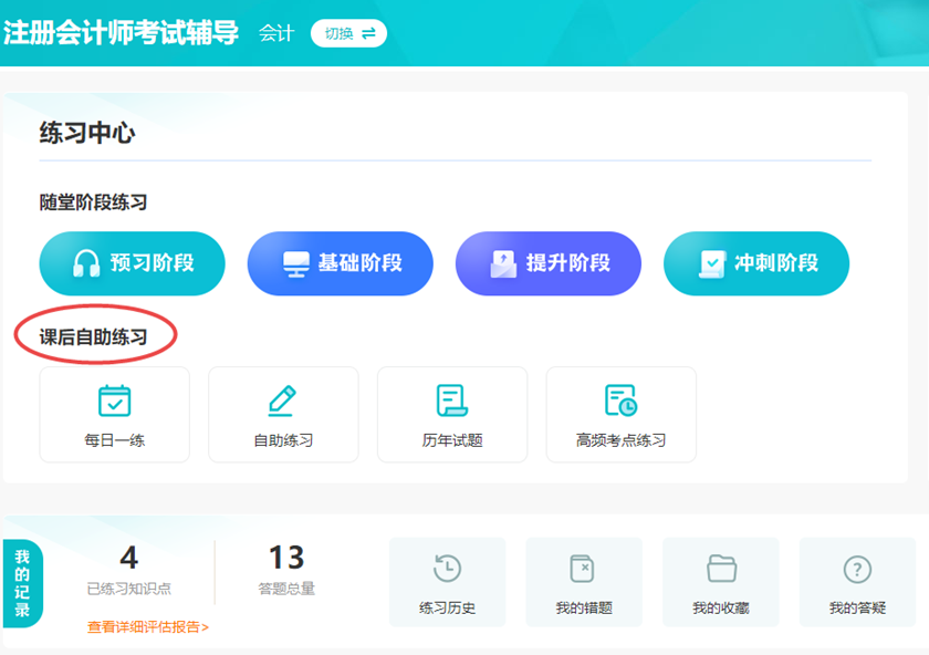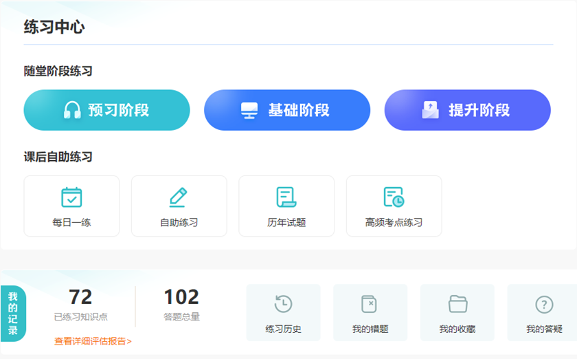 課后自助練習:每日一練、自助練習、歷年試題,可根據自己的時間安排做練習題鞏固,無時間限制,自由練習。
