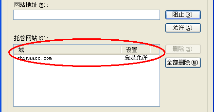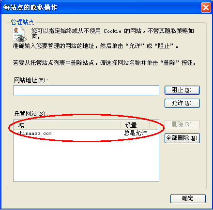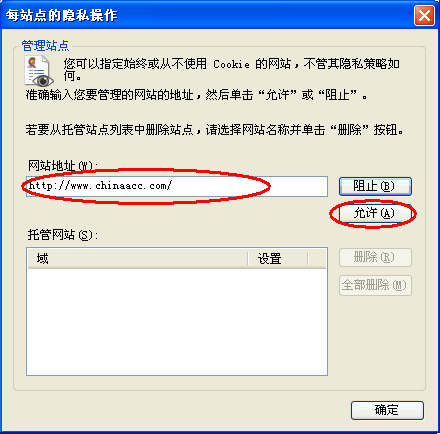 • 進入每個站點的隱私操作,添入網(wǎng)址點擊“允許”按鈕。