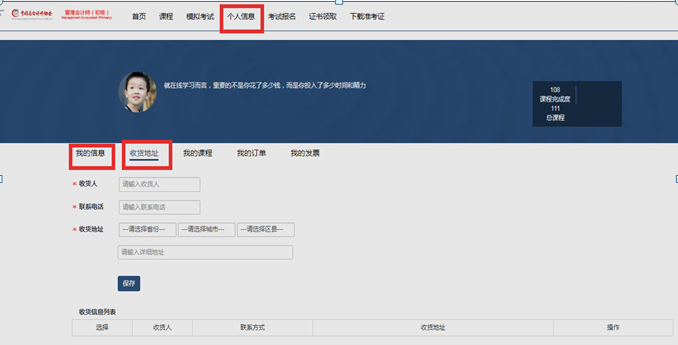 4.開通賬號(hào)后,完善個(gè)人信息,填寫郵寄地址、收貨人姓名、電話,等待郵寄教材