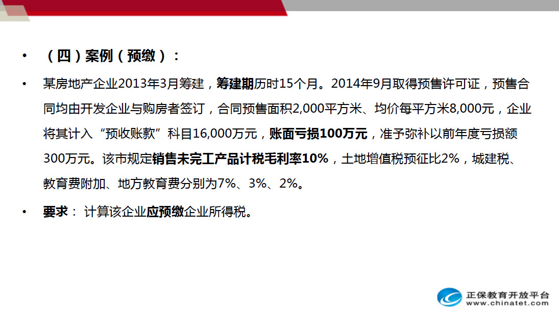 答:可以。總局所得稅司答復(fù):根據(jù)國稅發(fā)[2009]31號規(guī)定,企業(yè)銷售未完工產(chǎn)品取得收入,應(yīng)計算出預(yù)計毛利額計入當(dāng)期應(yīng)納稅所得額。同時,企業(yè)在計算繳納當(dāng)期所得稅時,可扣除當(dāng)期發(fā)生的期間費用、營業(yè)稅、土地增值稅等。
