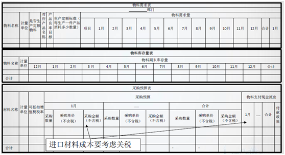 進口材料,合同簽訂一般是不含增值稅和關稅的,我們會計的材料成本是含關稅不含增值稅的,所以在采購部做進口材料預算的時候,要提醒他們注意進口材料成本是含關稅的,要讓他們考慮進去。進口材料涉及進口關稅和進口增值稅繳納,繳納給海關的進口關稅由采購部一并考慮,進口增值稅由財務部根據采購部的物料采購預算進行計算,編制在稅金預算表中。