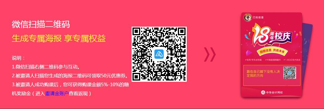 微信掃描二維碼生成專屬海報,被邀請人通過掃描你海報上的二維碼成功購課后,你將獲得購課金額5%-10%的隨機獎勵金!
