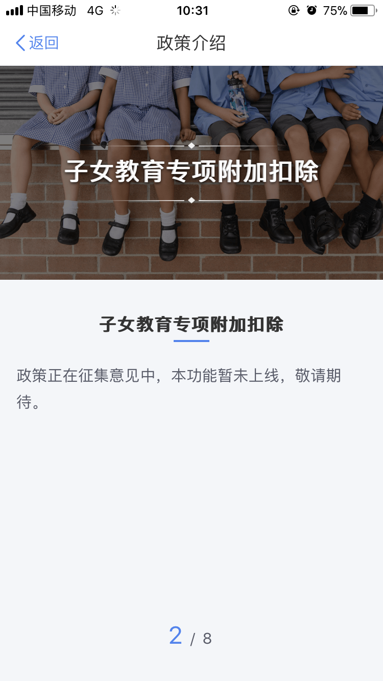 返回到APP主界面,點(diǎn)擊【2019新政策】,即可便捷查詢了解六大專項(xiàng)扣除的解讀及年度綜合申報(bào)等新政策,不過目前該板塊的內(nèi)容、功能暫未上線,等2019年1月1日上線后即可正常使用。