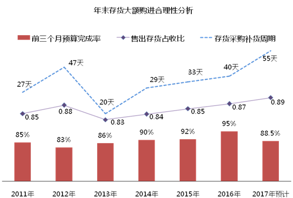 根據采購部門的解釋,2017年的供貨周期預計達到55天,為保證銷售(營銷部預計1-2月銷售收入2133萬元),在年末集中采購了3000萬元的存貨。
